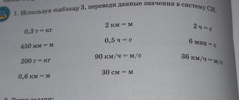E) 1. Используя таблицу 3, переведи данные значения в систему СИ. 0,3 т = кг 2 км = м 2 ч= C 450 мм = М 0,5ч = с 6 мин = C 200 г = кг 90 км/ч = м/с 36 км/ч = м/с 0,6 км = М 30 см = м