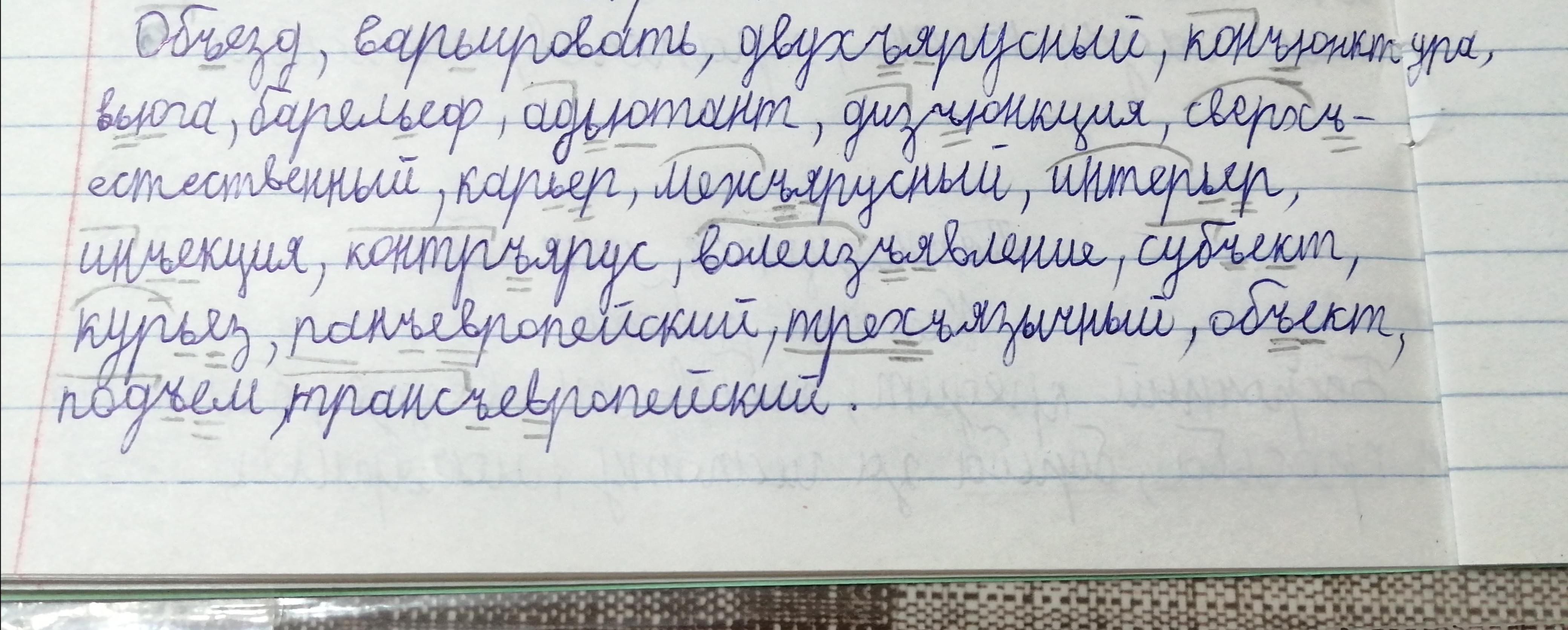 4. Прочитайте слова, объясните их правописание. Значение неизвестных вам слов найдите в Толковом словаре. Объезд, варьировать, двухъярусный, конъюнктура, вьюга, барельеф, адъютант, дизъюнкция, сверхъестественный, карьер, межъярусный, интерьер, инъекция, контръярус, волеизъявление, субъект, курьез, панъевропейский, трехъязычный, объект, подъём, трансъевропейский.