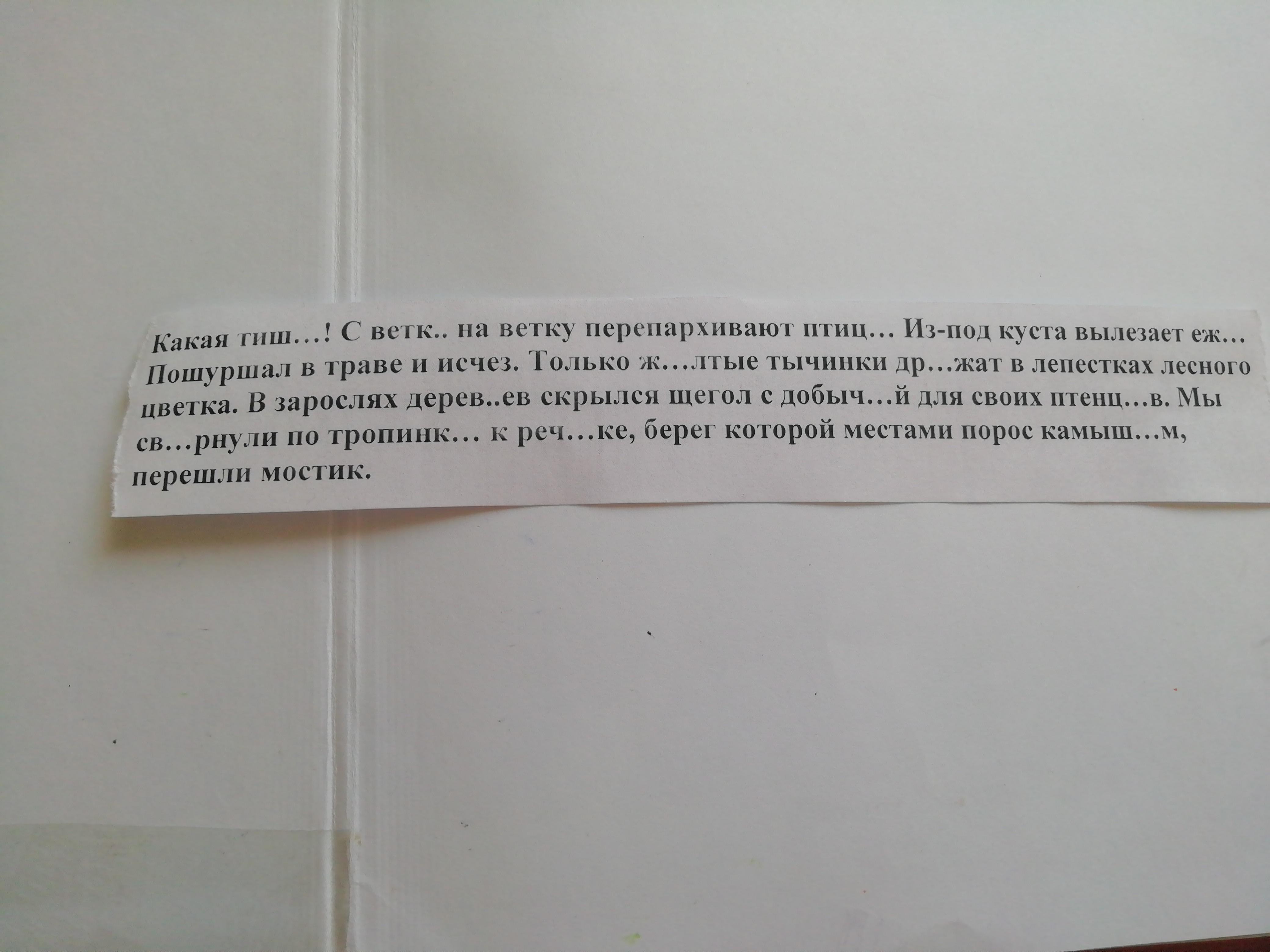 Какая тиш...! С ветки...на ветку перепахивают птиц... Из под куста вылезает еж... Пошуршал в траве и исчез. Только ж...лтые тычинки др...жат в лепестках лесного цветка. В зарослях дерев...ев скрылся щегол с добыч...й для своих птенец...в. Мы св...рнули по тропинк... к реч...ке,берег которой местами порос камыш...м, перешли мостик.