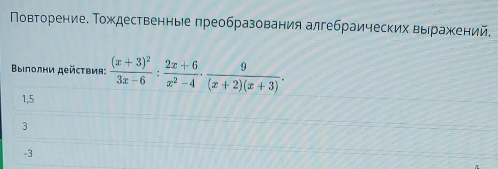 Повторение. Тождественные преобразования алгебраических выражений. (x + 3)? 2x + 6 9 Выполни действия: 3х – 6 х2 – 4 (x+2)(х+3) 1,5 3 -3 е Назад В Проверить