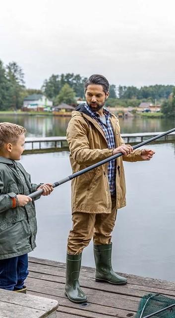 In this picture, dad and his son are standing by the river. they have a fishing rod in their hands, which tells us that they are fishing. in the background we see houses, it looks like they live in a village by the river. on the side of the picture we see nets or fish bait. the weather when they decided to fish is very bad because the sky is cloudy