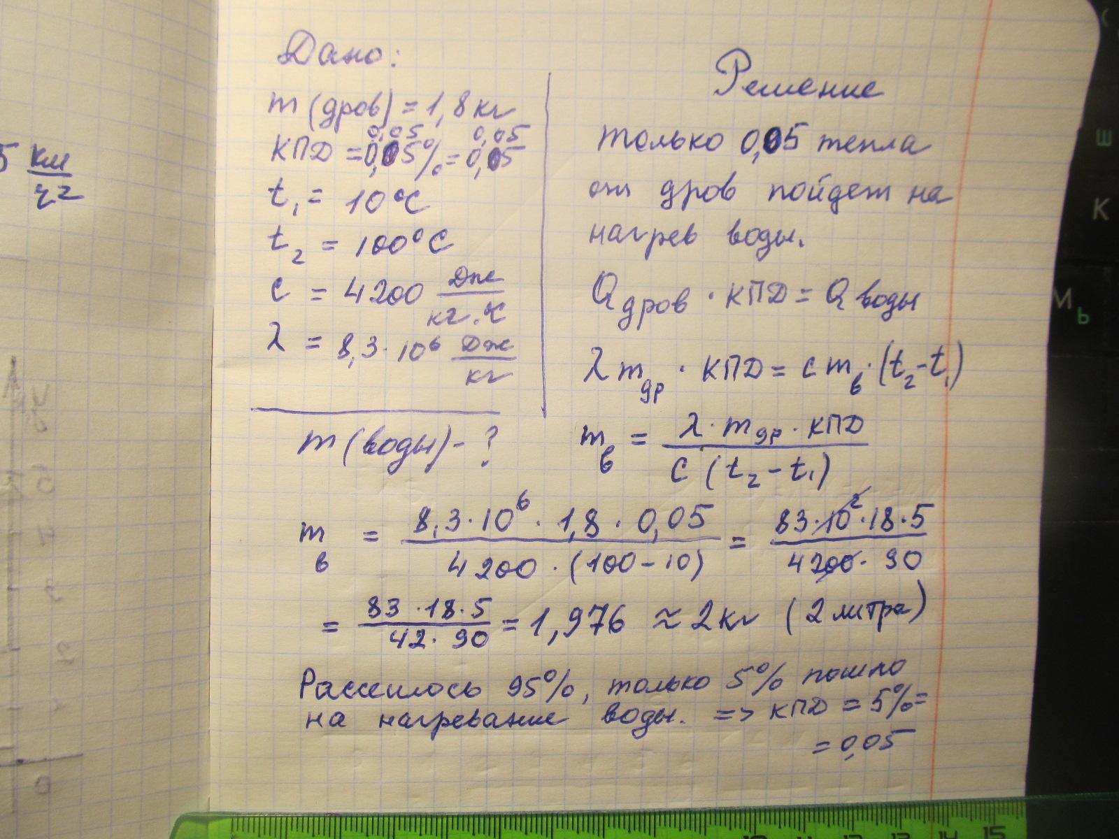 Какую массу воды можно нагреть до кипения при сжигании в костре 1,8 кг сухих дров, если в окружающую среду рассеивается 95% тепла от их сжигания? Начальная температура воды 10° С, удельная теплота сгорания сухих дров