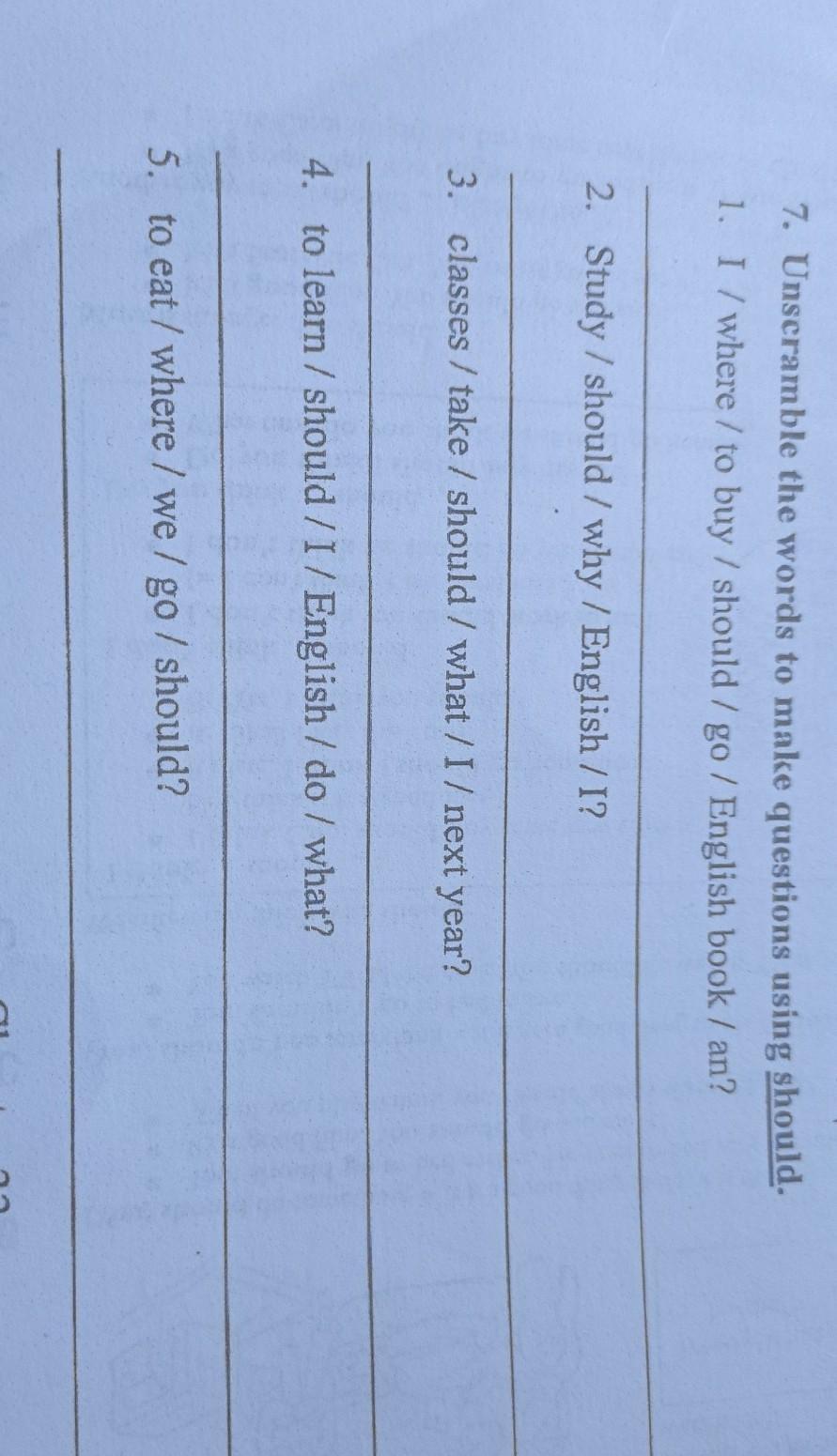 7. Unseramble the words to make questions using should. 1. I / where / to buy / should / go / English book / an? 2. Study / should / why / English / I? 3. classes / take / should / what/I / next year? 4. to learn / should/I/ English / do / what? 5. to eat / where / we/go/ should?