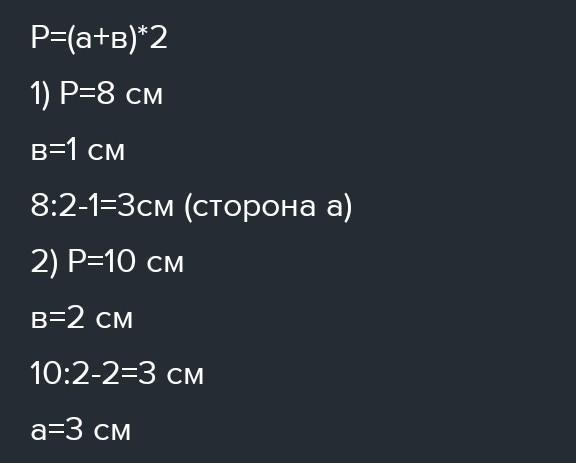 выразите длину а прямоугольника через его ширину и периметр Р. Найдите а, если Ви Р соответственно равны: 1) 1 см и 8 см; 2) 2 см и 10 см.