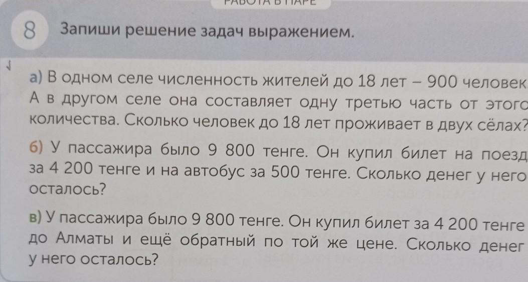 РАБОТА В ПАРЕ 8 Запиши решение задач выражением. а) В одном селе численность жителей до 18 лет - 900 человек. А в другом селе она составляет одну третью часть от этого количества. Сколько человек до 18 лет проживает в двух сёлах? 6) У пассажира было 9 800 тенге. Он купил билет на поезд за 4 200 тенге и на автобус за 500 тенге. Сколько денег у него осталось? в) У пассажира было 9 800 тенге. Он купил билет за 4 200 тенге до Алматы и ещё обратный по той же цене. Сколько денег у него осталось?