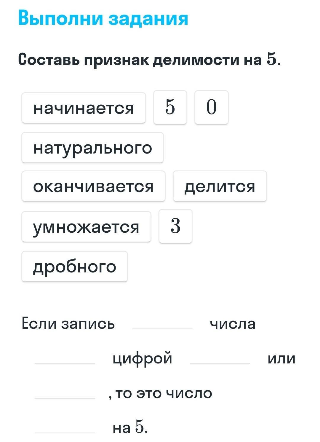 Если запись натурального числа оканчивается на 5 или 0, то это число делится на 5.