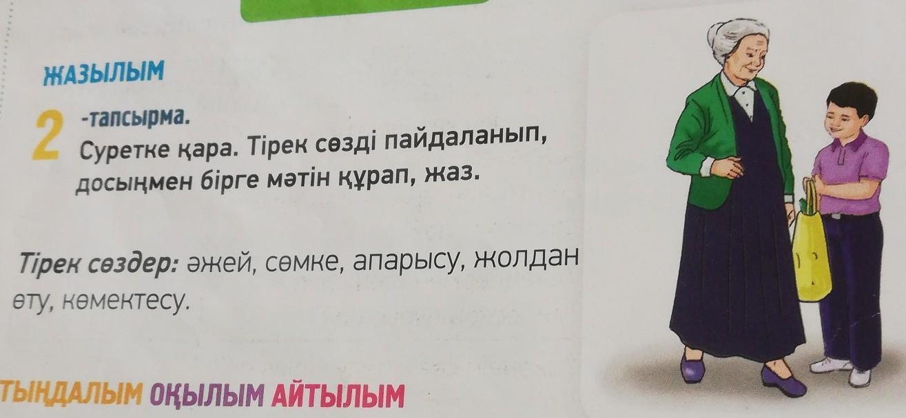 Составить предложение по картинке со словами: әжей, сөмке, апарысу, жолдан, өту, көмектесу.