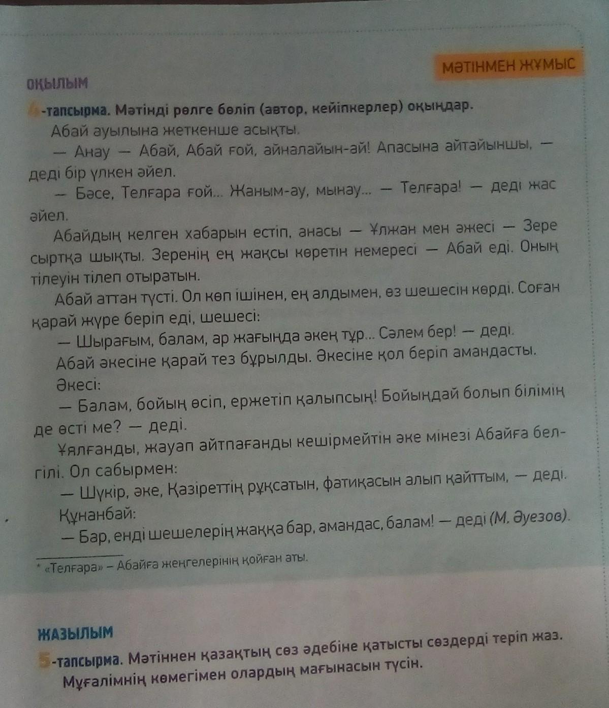 ЖАЗЫЛЫМ 5-тапсырма. Мәтіннен қазақтың сөз әдебіне қатысты сөздерді теріп жаз. Мұғалімнің көмегімен олардың мағынасын түсін.