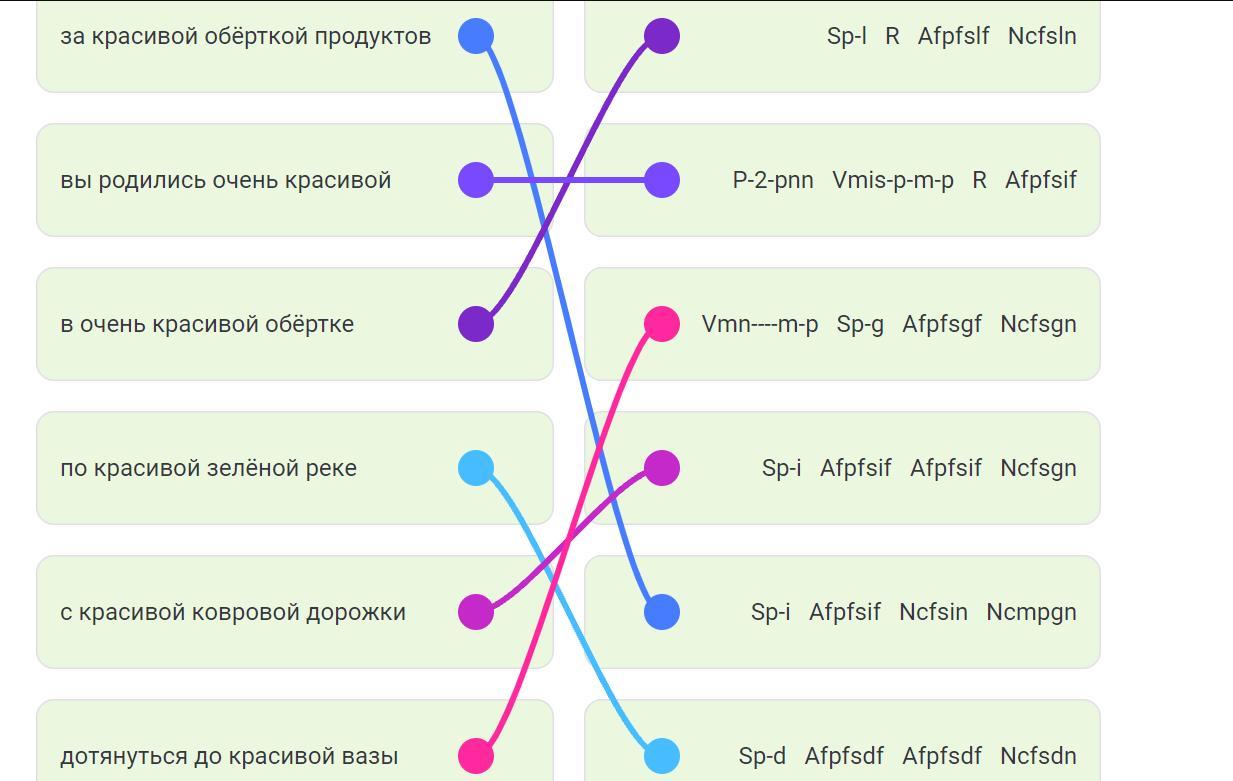 Даны 6 последовательностей слов и в перепутанном порядке их разборы в системе MULTEXT-East, которые приписаны им в корпусе текстов с автоматической морфологической разметкой. Известно, что в одном из разборов допущены три ошибки.