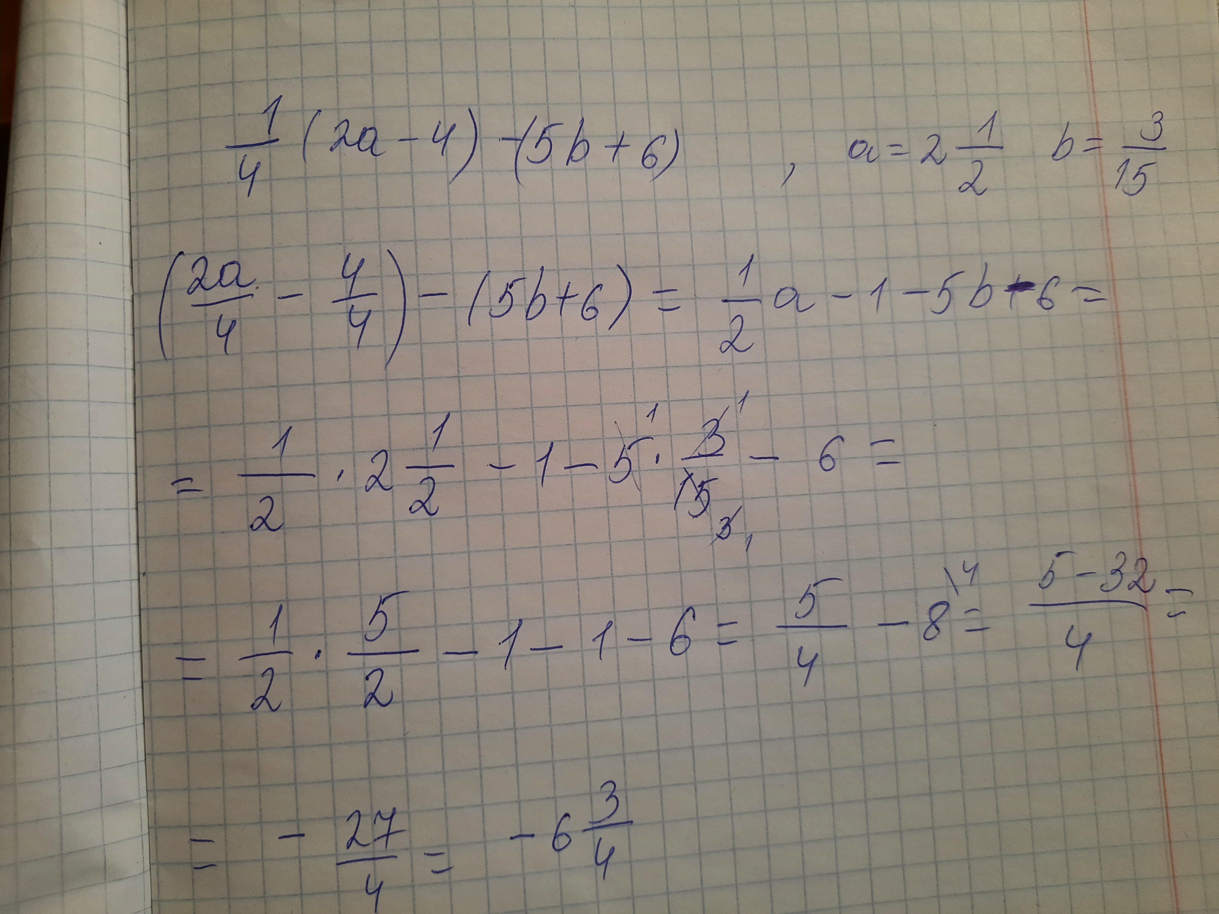 2.3 Упростите выражение 1/4 (2a-4) - (5b +6) и найдите его значение при a =2½, b = 3 /15