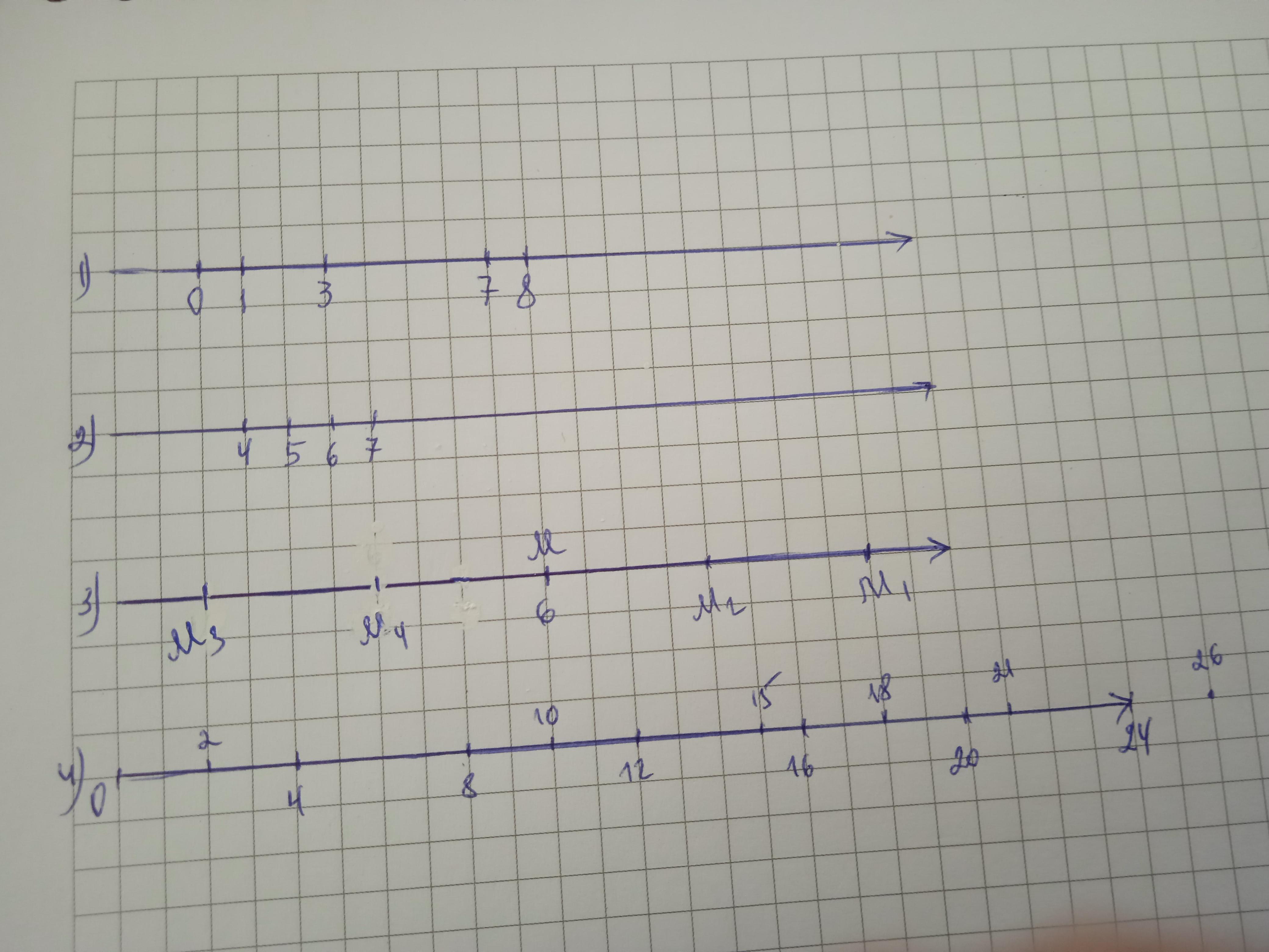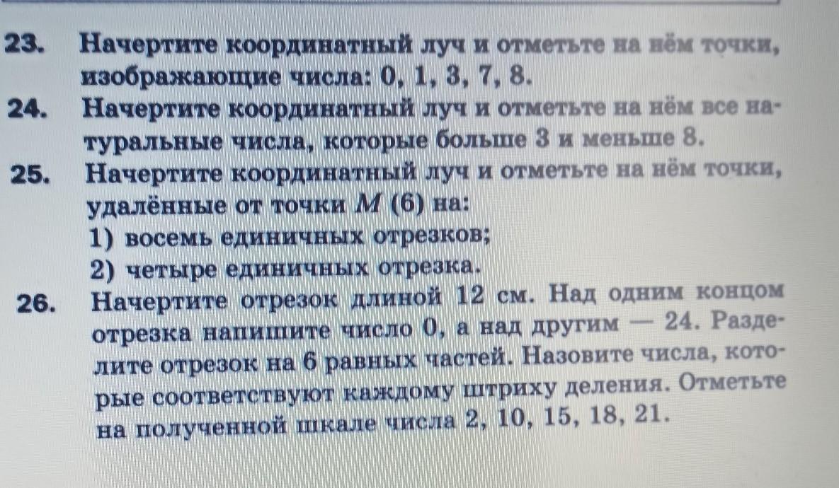 23. 24. 25. Начертите координатный луч и отметьте на нём точки, изображающие числа: 0, 1, 3, 7, 8. Начертите координатный луч и отметьте на нём все на- туральные числа, которые больше 3 и меньше 8. Начертите координатный луч и отметьте на нём точки, удалённые от точки м (6) на: 1) восемь единичных отрезков; 2) четыре единичных отрезка. Начертите отрезок длиной 12 см. Над одним концом отрезка напишите число 0, а над другим 24. Разде- лите отрезок на 6 равных частей. Назовите числа, кото- рые соответствуют каждому штриху деления. Отметьте на полученной шкале числа 2, 10, 15, 18, 21. 26.