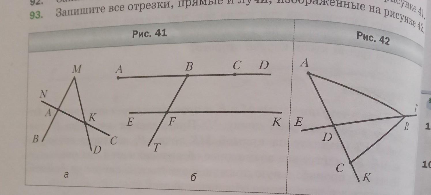номер 93, запишите все отрезки, прямые и лучи, изображённые на рисунке 42.