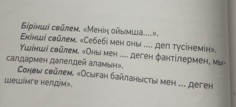 Бірінші сөйлем. «Менің ойымша, ...». Екінші сөйлем. «Себебі мен оны .... деп түсінемін». Үшінші сөйлем. «Оны мен деген фактілермен, мысалдармен дәлелдей аламын». Соңғы сөйлем. «Осыған байланысты мен ... деген шешімге келдім».