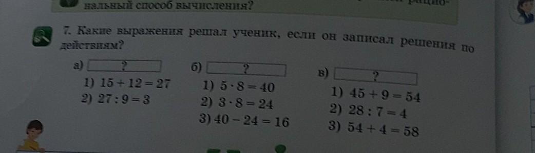 7. Какие выражения решал ученик, если он записал решения по действиям? а) ? 6 ? ? 1) 15 + 12 = 27 1) 5.8 = 40 1) 45 + 9 = 54 2) 27:9=3 2) 3.8 = 24 2) 28: 7 = 4 3) 40 - 24 = 16 3) 54 + 4 = 58
