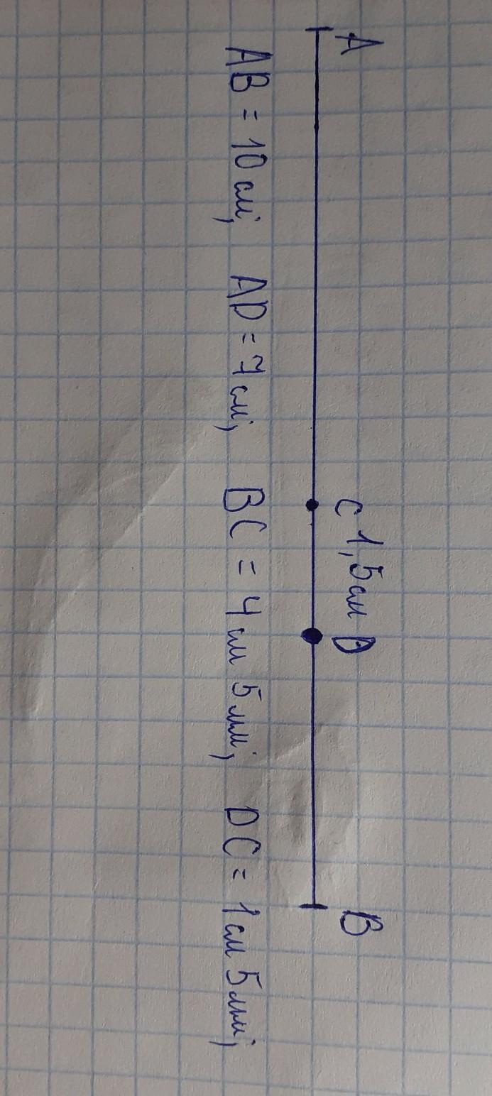 Начертите отрезок АВ=10 см и отметьте на нём точки С и D так,что АD=7см,ВС=4 см 5 мм.Чему равна длина отрезкаDC?