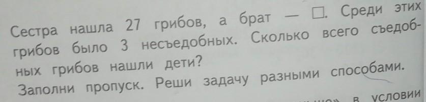 Сестра нашла 27 грибов, а брат –?Среди этих грибов было 3 несъедобных. Сколько всего съедоб- ных грибов нашли дети? Заполни пропуск. Реши задачу разными способами.