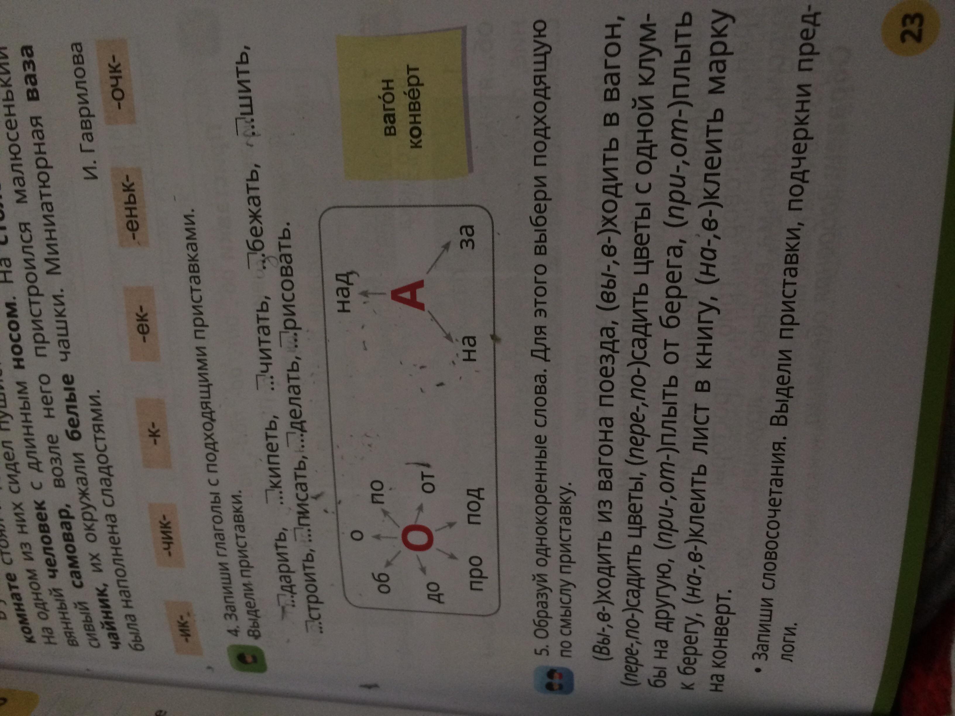 выходить из вагона поезда,входить в вагон,посадить цветы,пересадить цветы с одной клумбы на другую,отплыть от берега,приплыть к дереву,вклеить лист в книгу,наклеить марку на конверт