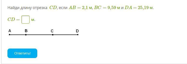 Найди длину отрезка CD, если AB= 2,1 м, BC= 9,59 м и DA = 25,19 м.