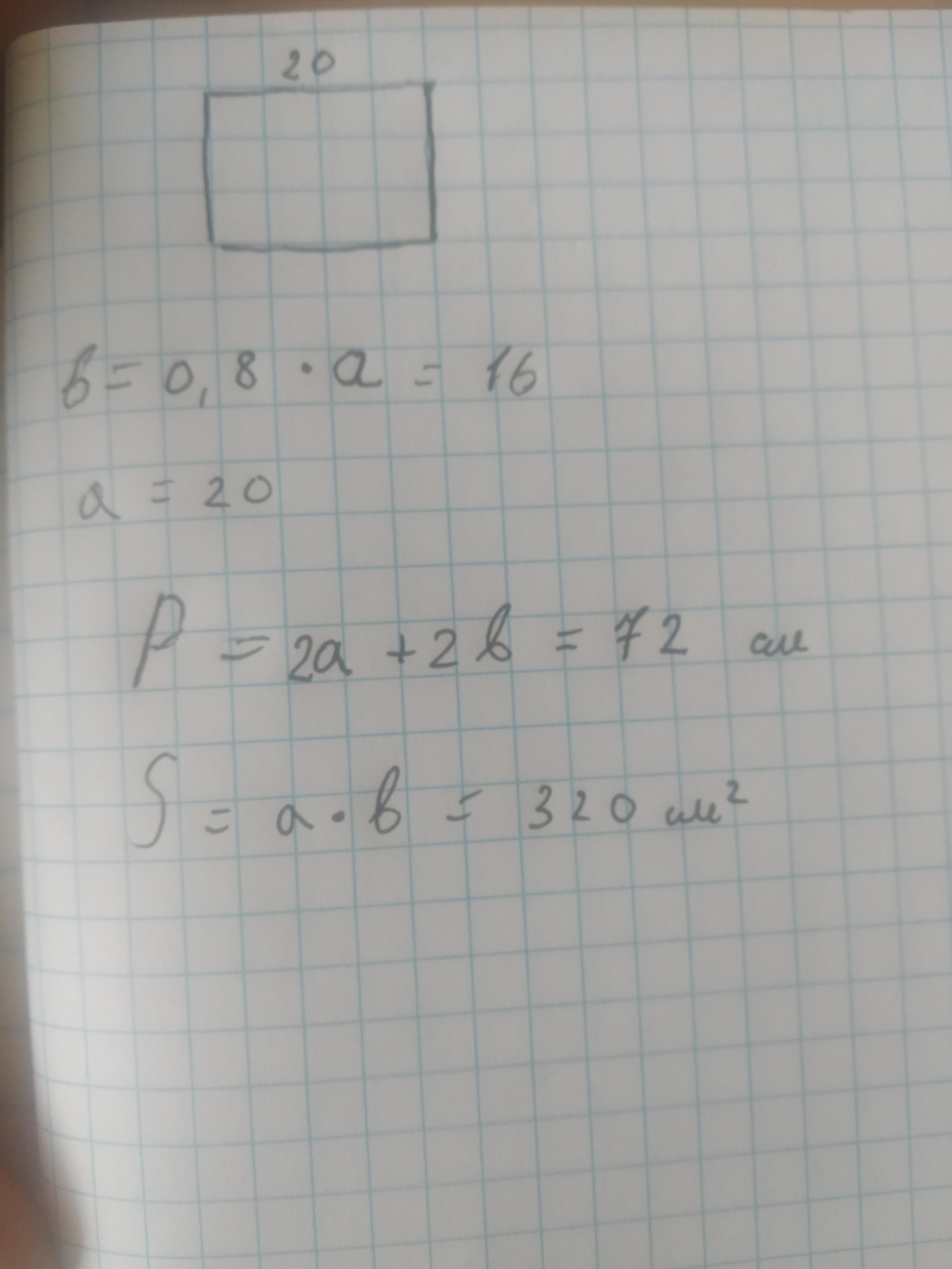Одна сторона прямоугольника равна 20 см, а другая составляет 80% длины первой. Найдите периметр и площадь этого прямоугольника