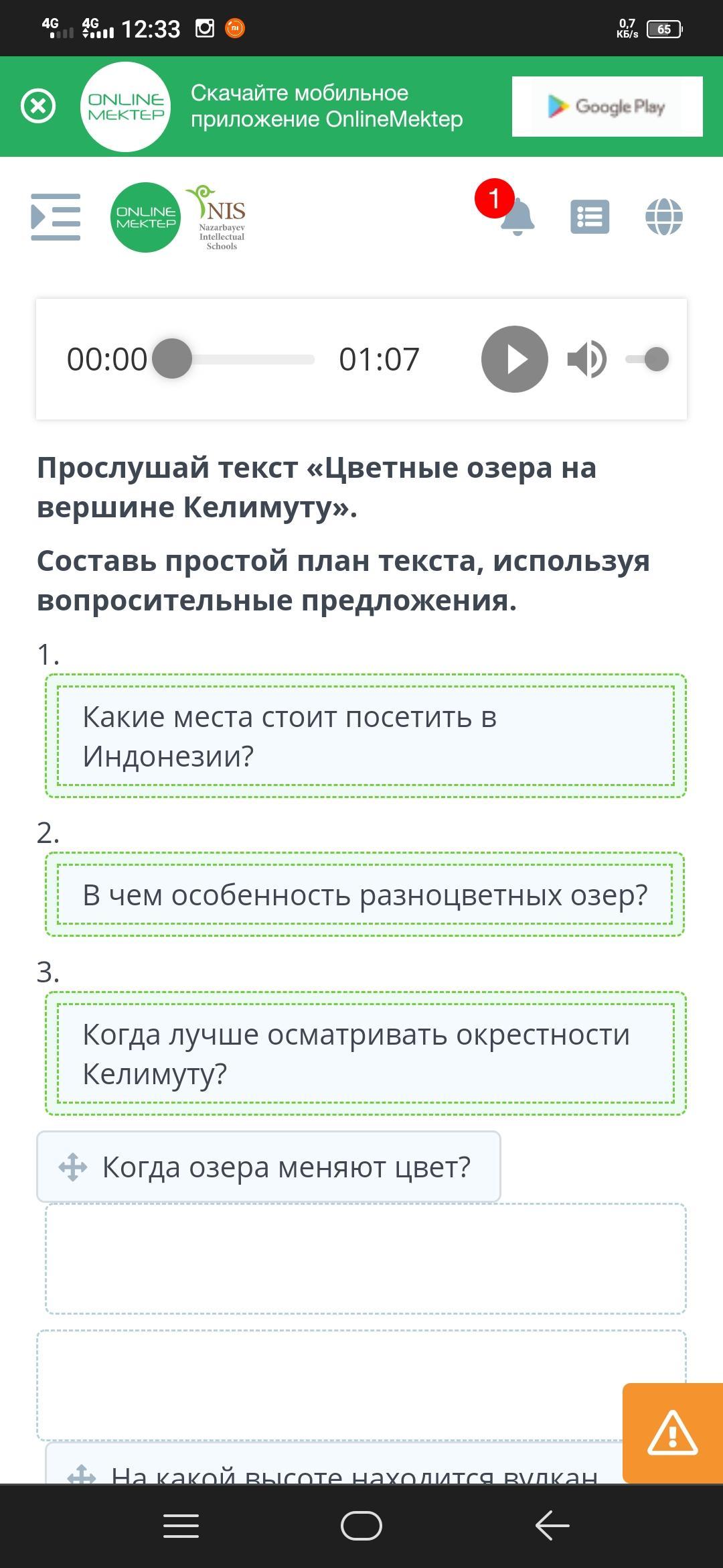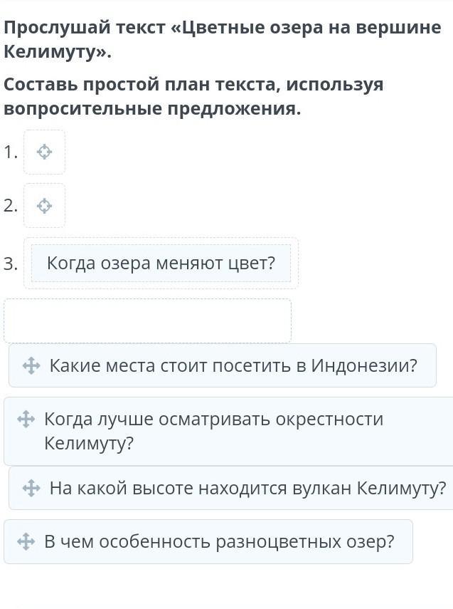 Прослушай текст «Цветные озера на вершине Келимуту». Составь простой план текста, используя вопросительные предложения.