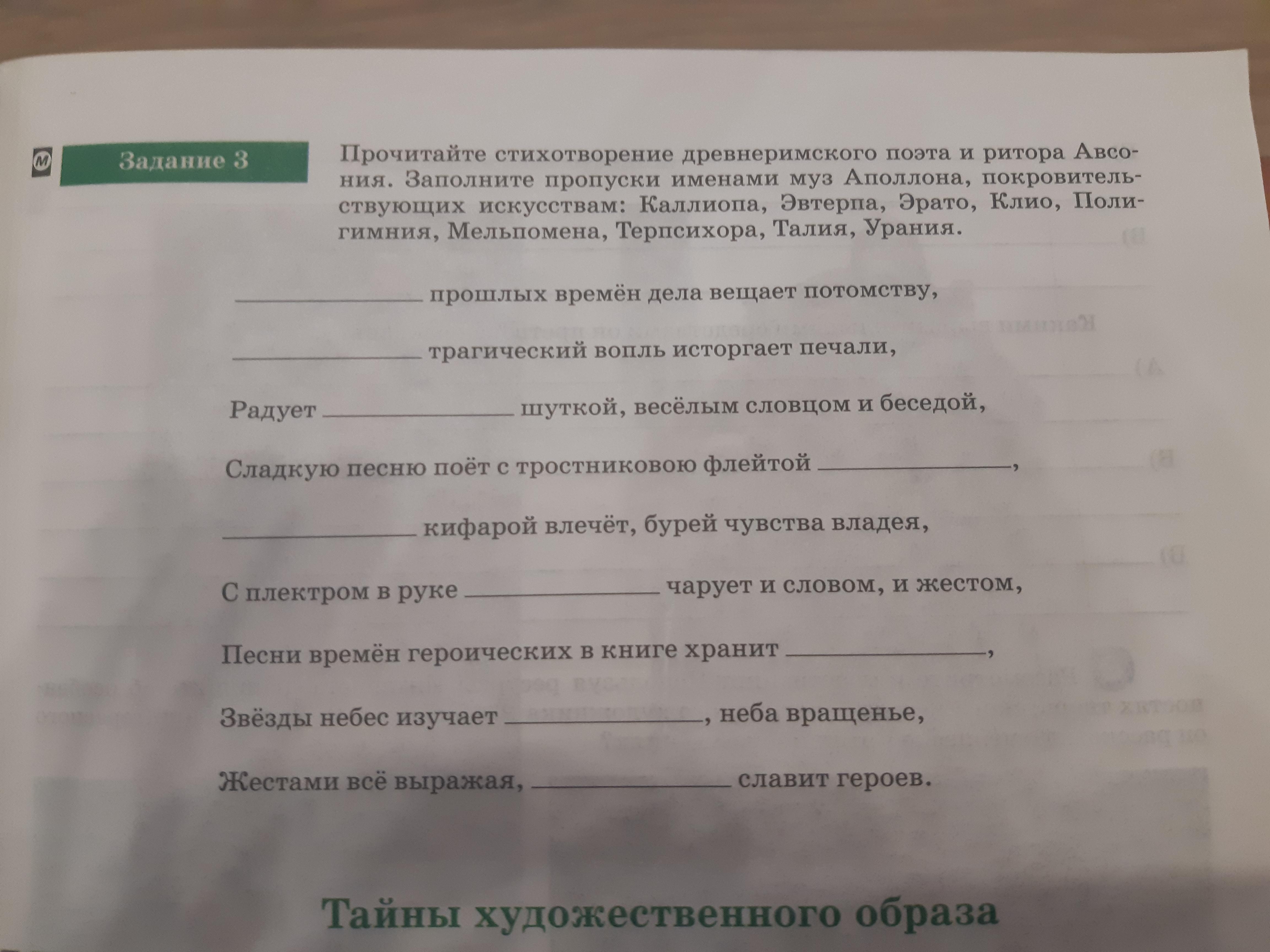 Клио, Мельпомена, Талия, Эвтерпа, Терпсихора, Эранго, Камлиопа, Урания, Полишмания.