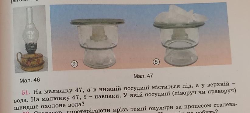 22 a 6 Мал. 46 Мал. 47 51. На малюнку 47, а в нижній посудині міститься лід, а у верхній вода. На малюнку 47, б – навпаки. У якій посудині (ліворуч чи праворуч) швидше охолоне вода?