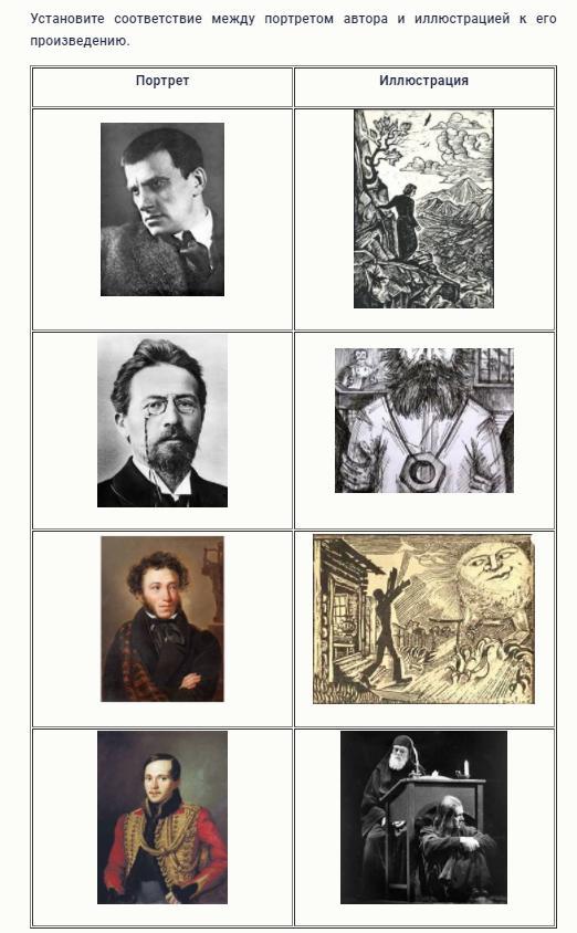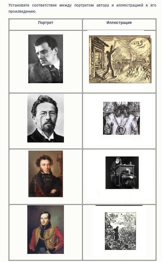 Установите соответствие между портретом автора и иллюстрацией к его произведению.