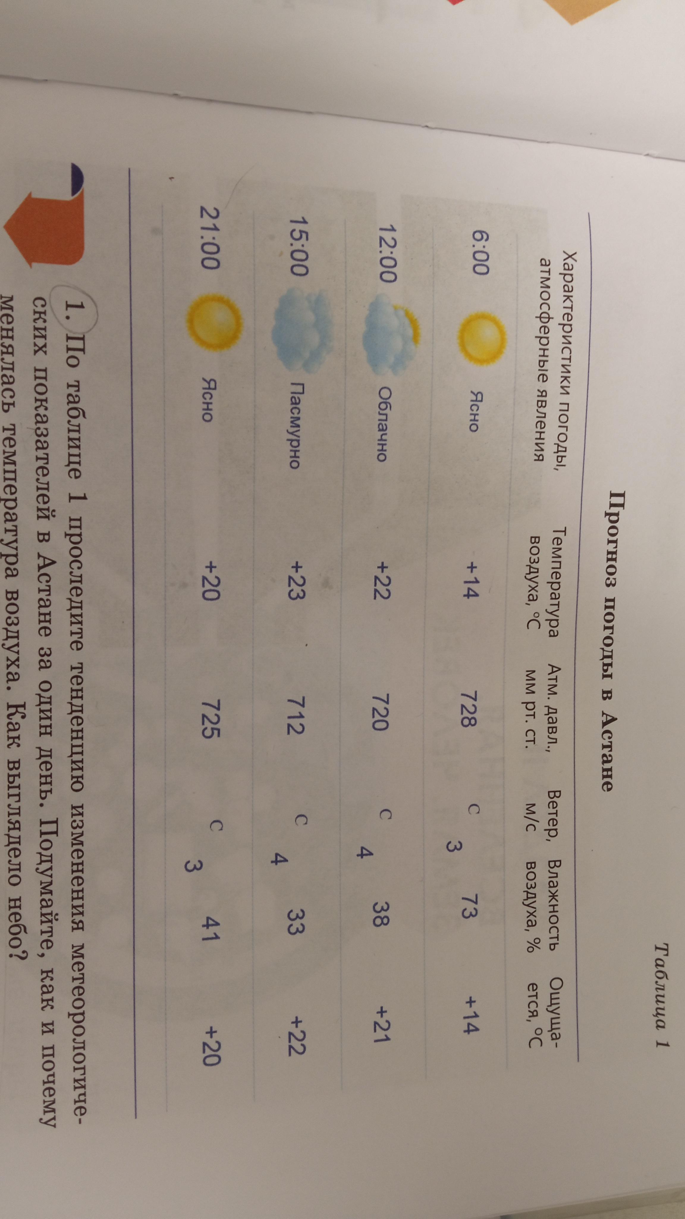 По таблице номер один проследите тенденцию изменения метеорологических показателей в Астане за один день. Подумайте как и почему менялась температура воздуха. Как выглядело небо ?
