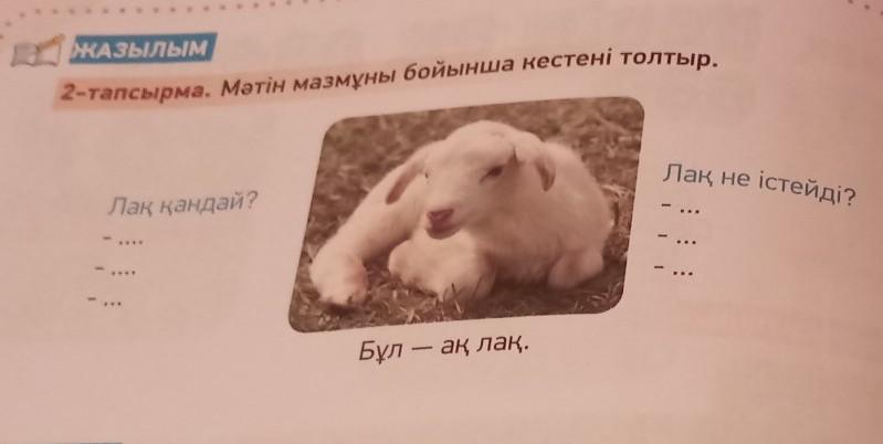 ЖАЗЫЛЫМ 2-тапсырма. Мәтін мазмұны бойынша кестені толтыр. Лаң не істейді? Лақ қандай? 1 Бұл - ақ лақ.