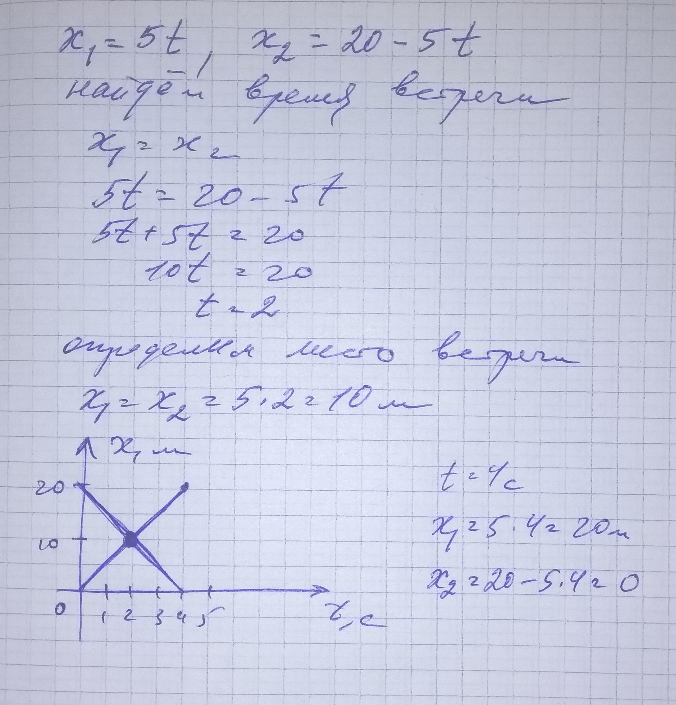 Вдоль оси X движутся тела так, что зависимость координаты от времени выражена уравнениями: x1 = 5t (м) и x2 = 20 - 5t (м). Определите время и координату места встречи тел. Решите задачу аналитически и графически. Что означает точка пересечения графиков?