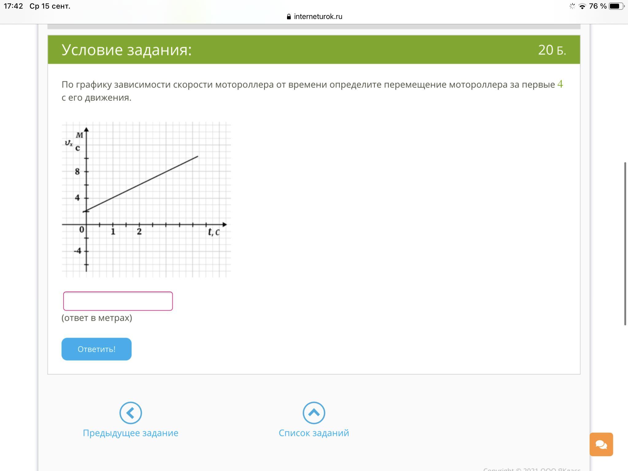 По графику зависимости скорости мотороллера от времени определите перемещение мотороллера за первые 4 с его движения.