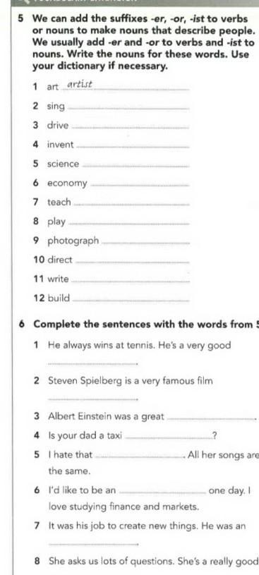 в пятом задании просто поставь окончания er, or, ist, все логично.
