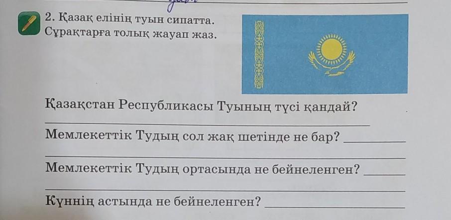 2. Қазақ елінің туын сипатта. Сұрақтарға толық жауап жаз. Қазақстан Республикасы Туының түсі қандай? Мемлекеттік Тудың сол жақ шетінде не бар? Мемлекеттік Тудың ортасында не бейнеленген? Күннің астында не бейнеленген?