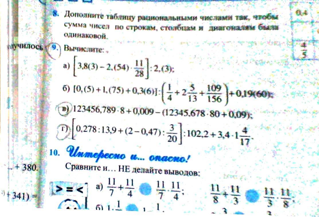 в)сначала решаем то, что в скобках: 12345,678*80+0,09=987654,33; затем решаем вне скобок: 123456,789*8+0,009=987654,321; а уже потом вычитаем полученные значения: 987654,321 - 987654,33 = −0,00899999996.