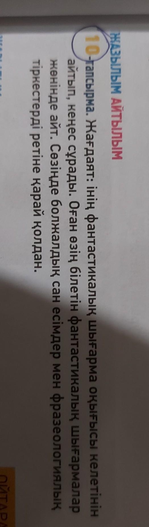 Мен он шақты фантастикалық шығарма білемін,оның бәрін әр сәттің арасында шапшаң оқып бітірдім. Саған бес-төрттей шығарма айтып берейін! А. Машанидің 1957 жылы жарық көрген "Жер астына саяхат" кітабын, Т. Сұлтанбеков. "Лұхман Хакім", М. Сәрсеке. "Ғажайып сәуле", Ж. Сахиев. "Шолпанға көшкен ауыл", Ж. Сахиев. "Космотарих куәсін" міндетті түрде оқып көруге кеңес беремін.
