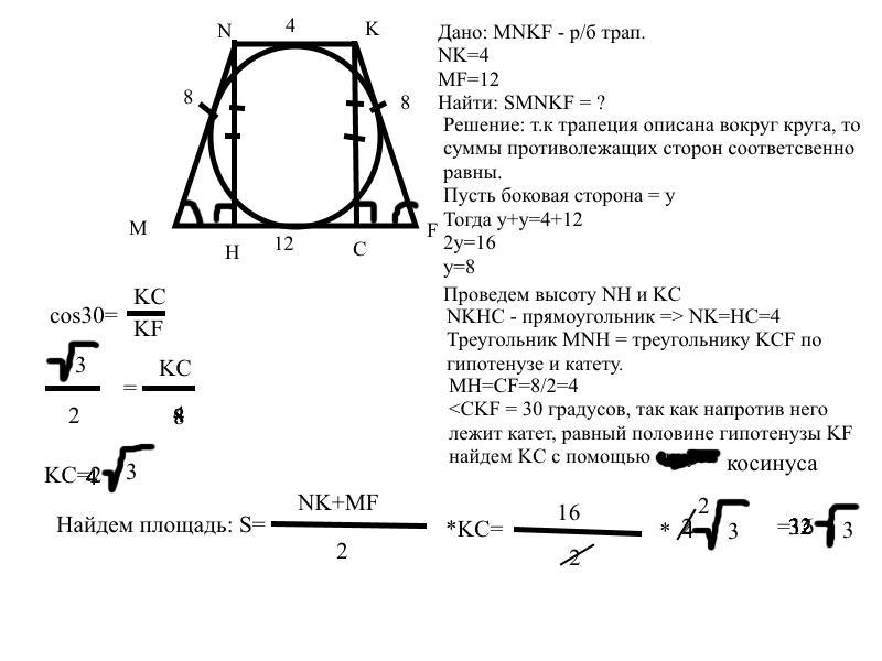 Равнобедренная трапеция MNKF описана вокруг круга. Найти площадь трапеции, если основания NK и MF соответственно равны 4 см и 12 см.