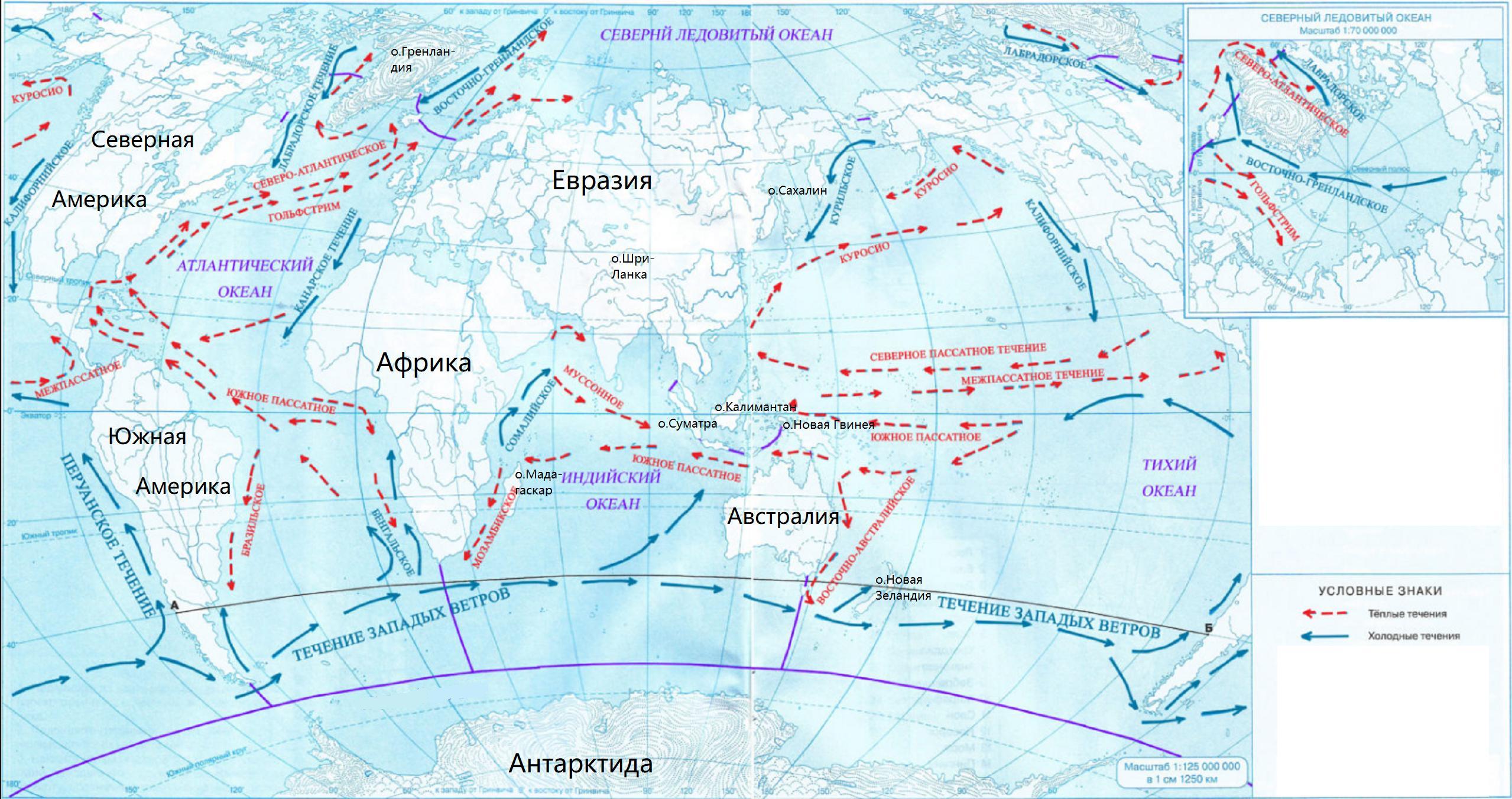 Нанесите на контурную карту мира и подпишите океаны, материки и крупнейшие острова (5–6 примеров), крупнейшие тёплые и холодные течения. Тёплые изобразите красным цветом (5–6 примеров), а холодные – синим или чёрным (5–6 примеров). Используйте карты атласа (карты Мирового океана).