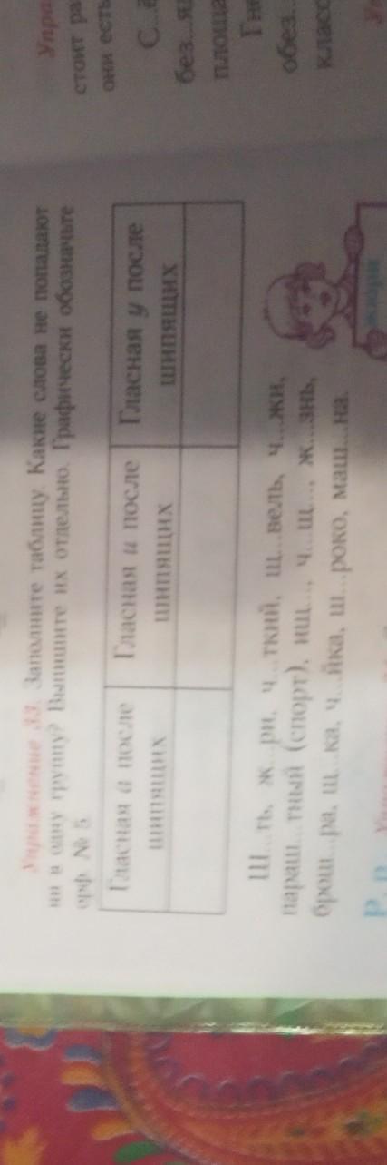 Упражнение 33. Заполните таблицу. Какие слова не попадают ни в одну группу? Выпишите их отдельно. Графически обозначьте орф. № 5. Гласная а после Гласная и после Гласная у после шипящих