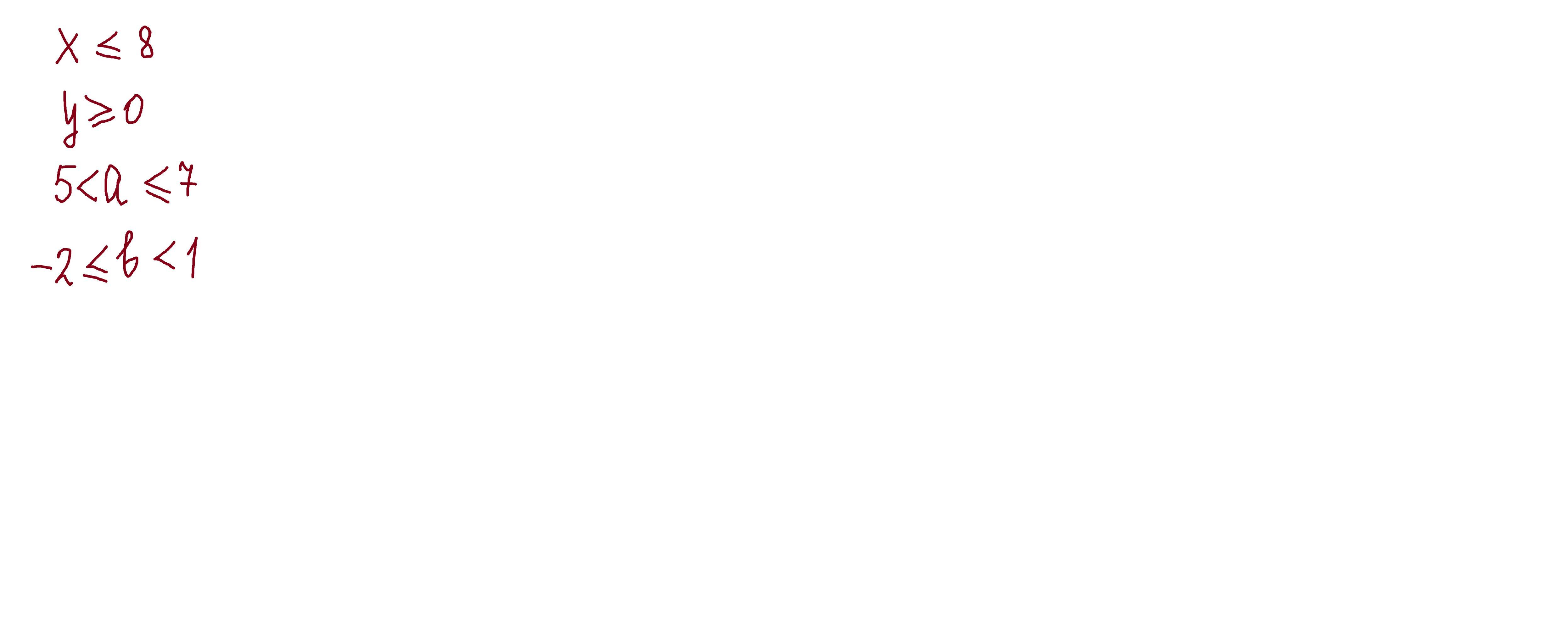 неравенства: а) х меньше или равно 8; б) у больше или равно 0; а больше 5 и меньше или равно 7; г) ь больше или равно -2 и меньше 1.