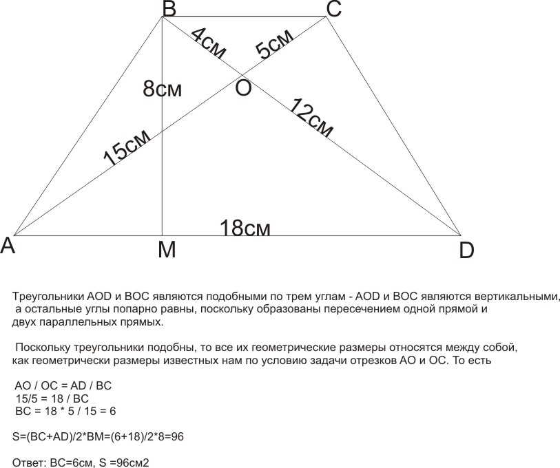 В трапеции АВСД,АД и ВС основания ,диагонали пересекаются в т.О так,что ВО=4 см,ОС=5 см,АО=15 см,ОД=12 см,АД=18см.Найти ВС и площадь трапеции,если высота,проведённая из вершины В,равна 8см
