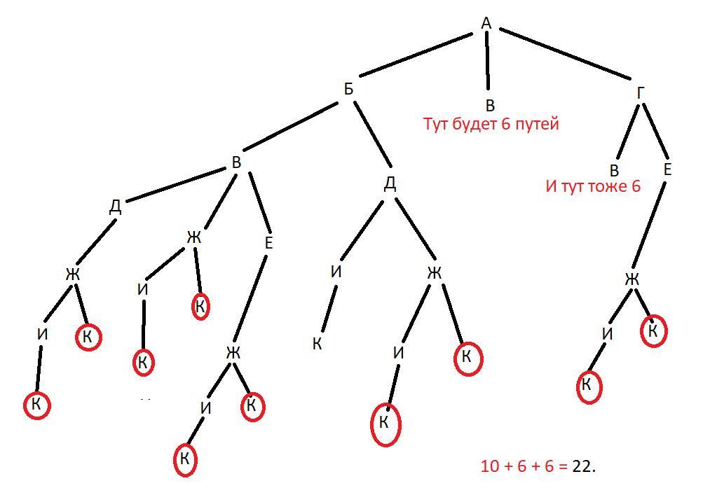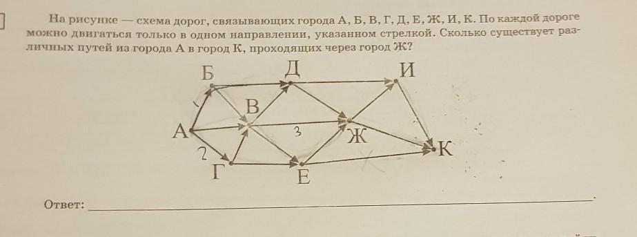 9 На рисунке — схема дорог, связывающих города А, Б, В, Г, Д, Е, Ж, И, К. По каждой дороге можно двигаться только в одном направлении, указанном стрелкой. Сколько существует раз- личных путей из города А в город К, проходящих через город Ж.