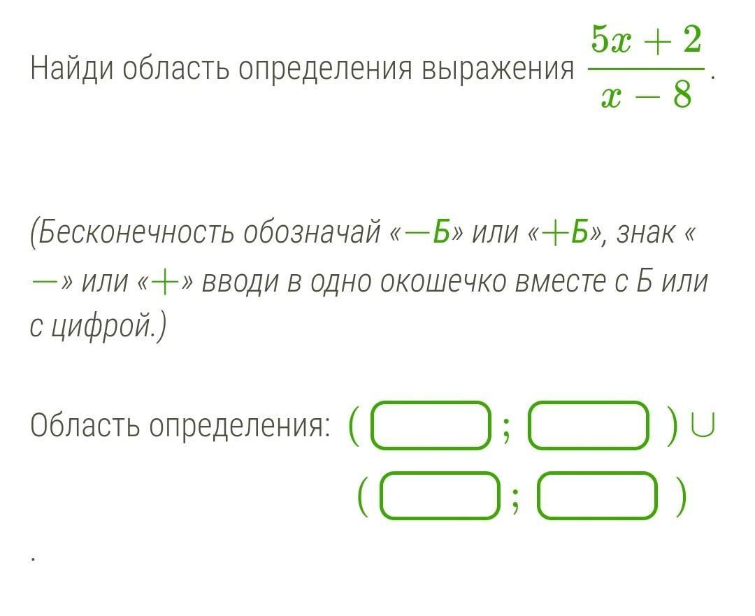 Найди область определения выражения 5x+2 : x−8. (Бесконечность обозначай «−Б» или «+Б», знак «−» или «+» вводи в одно окошечко вместе с Б или с цифрой.)