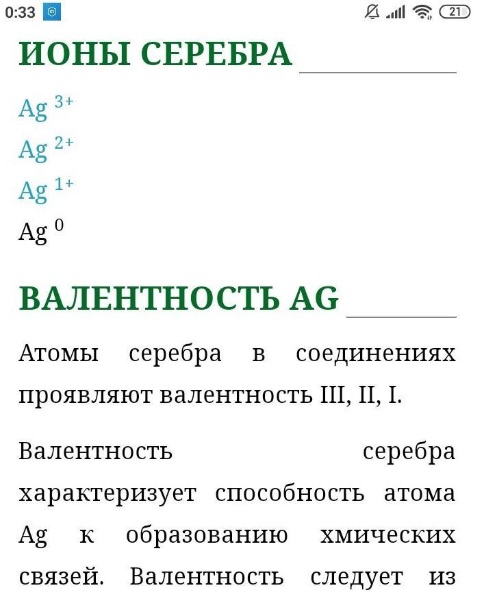 Ответ: В возбуждённом состоянии у серебра проявляется три валентности :1,2,3(только римскими цифрами).Вообще валентность в возбужденном состоянии -это валентность ,которая проявляется у элемента при окончательном взаимодействии с другими веществами (в солях,оксидах и т.д.)Удачки