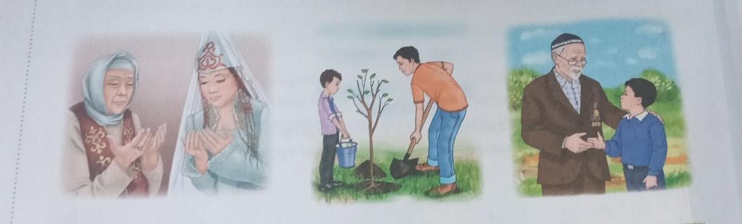 11-тапсырма. Өзің қалаған бір сурет бойынша диалог құрап жаз. Диалогте қазақтың сөз әдебіне тән бірліктерді пайдалан. Деректі,дерексіз зат есімдерді қолдан.