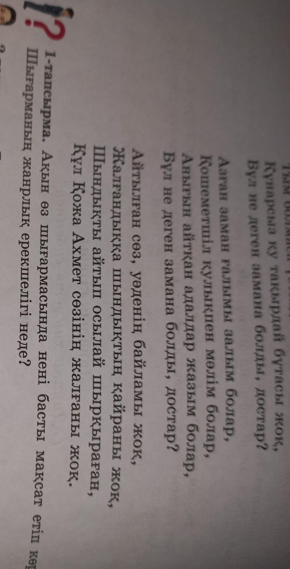 1-тапсырма. Ақын өз шығармасында нені басты мақсат етіп көрсетеді?Шығарманың жанрлық ерекшелігі неде?