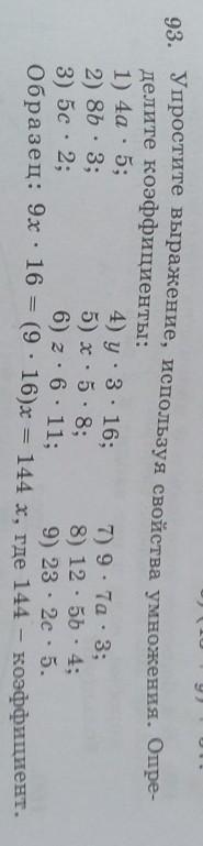 93. Упростите выражение, используя свойства умножения. Опре- делите коэффициенты: 1) 40.5; 4) у 3 : 16: 7) 9 - 7а - 3; 2) 8b 3; 5) x 5.8; 8) 12 . 5b. 4; 3) бе : 2; 6) 2.6.11; 9) 23. 2c. 5. Образец: 9x - 16 - (9 - 16)x - 144 x, где 144 коэффициент.