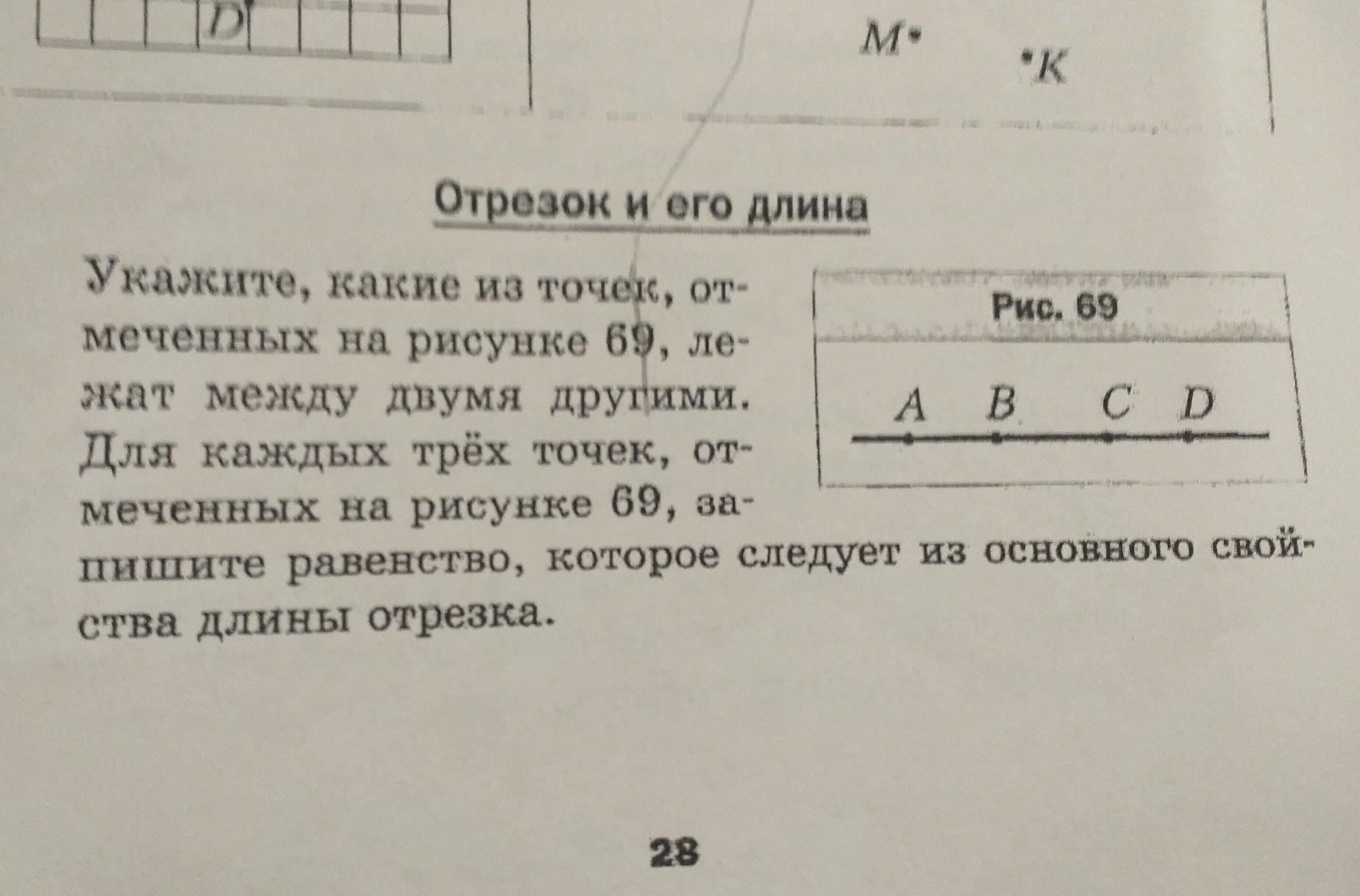 Укажите, какие из точек, отмеченных на рисунке 69 лежат между двумя другими для каждых трех точек отмеченных на рисунке 69 запишите равенство которые следует за основного свойства длинны отрезка даю 30 балов