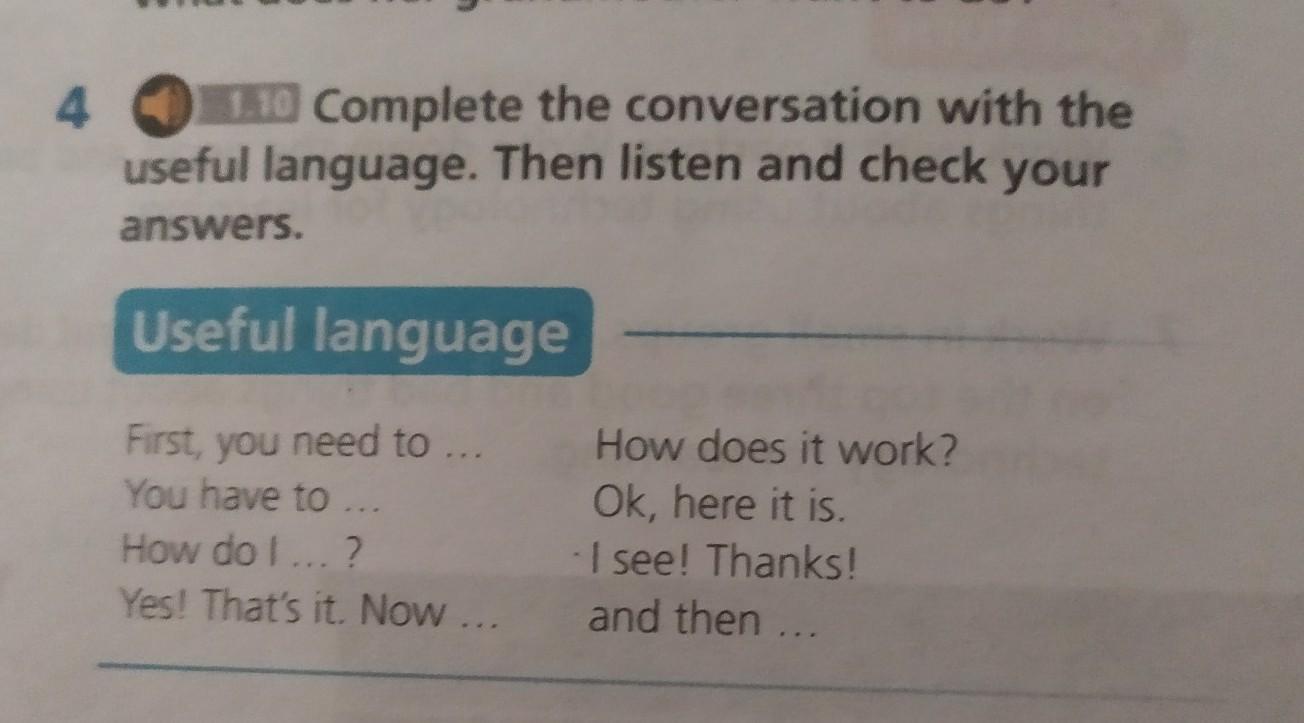 4 0 Complete the conversation with the useful language. Then listen and check your answers Useful language First, you need to You have to How do I...? Yes! That's it. Now ... How does it work? Ok, here it is I seel Thanksi and then пожалуйста срочно