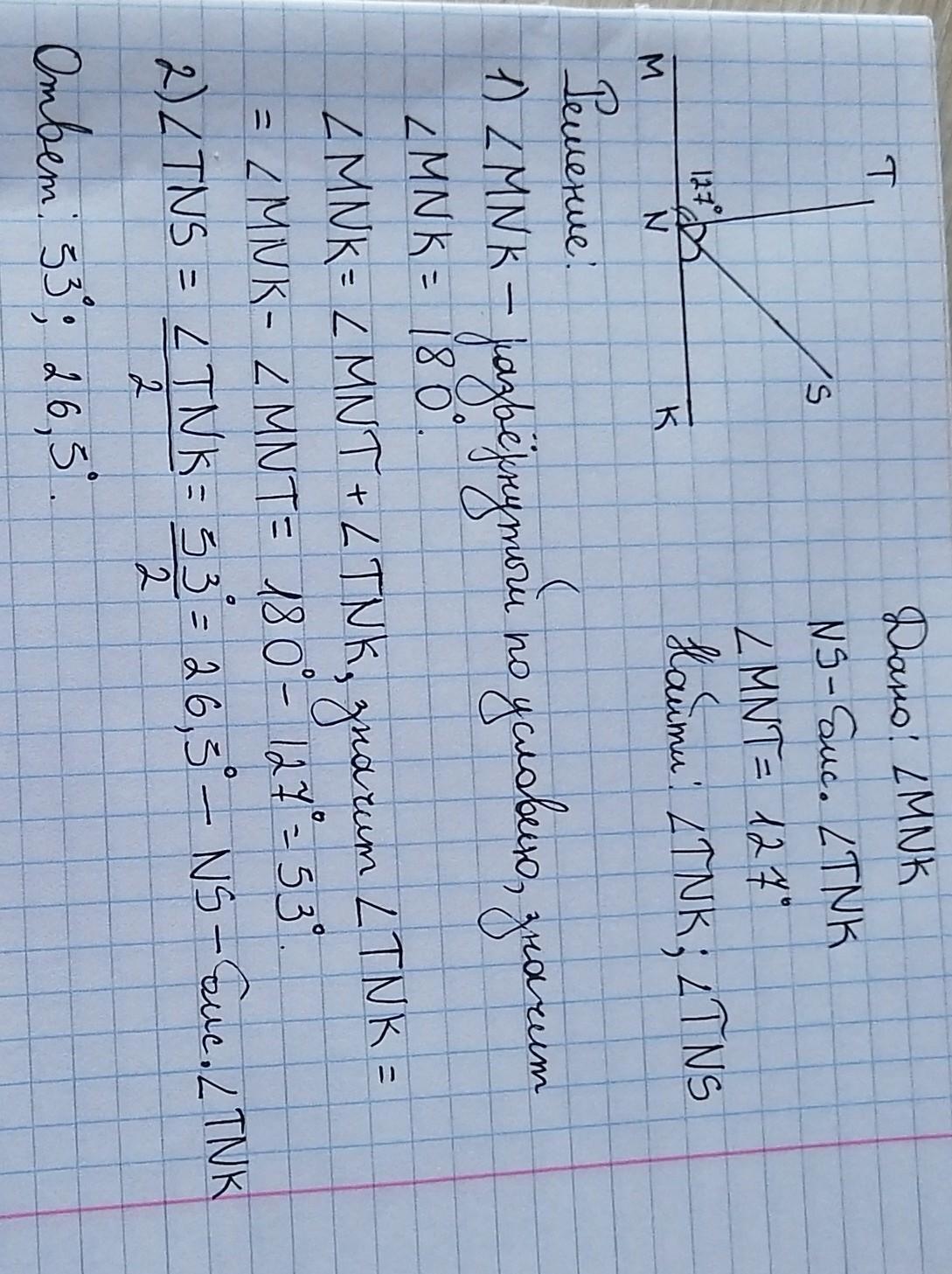 Дан развернутый угол MNK. Луч NS – биссектриса угла TNK. Чему равны градусные меры ∠TNK и ∠TNS, если ∠MNT = 127°?