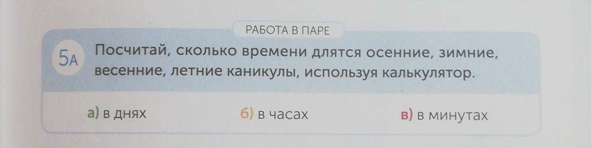 5A РАБОТА В ПАРЕ Посчитай, сколько времени длятся осенние, зимние, весенние, летние каникулы, используя калькулятор. а) в днях б) в часах в) в минутах помогите пожалуйстаааааа